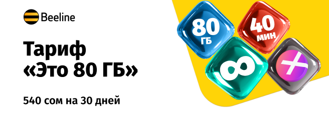 Переходы с тарифов «Gold», «Безлимит Platinum», «Бирге для интернета 590 + Иви», «Бирге для интернета + YouTube», «Безлимит+», «Роутер 30 дней», «Супер 640», «Супер 740», «Супер Pro 2.0», «Супер Max», «Безлимит месяц», «Это 100 GB», «Это 250 GB» на тариф «Это 80 GB» - 60 сомов.
